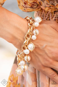 Classic white pearls and solitaire pearls that are threaded along a rod inside imperfect gold rings swing from a chunky double-linked gold chain around the wrist, creating a dramatic fringe. Features an adjustable clasp closure.