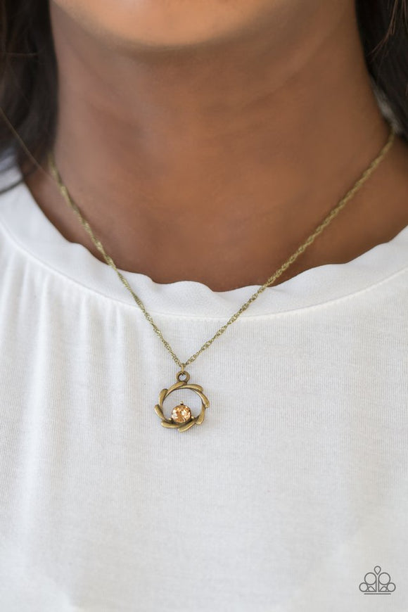 A glittery topaz rhinestone dots the bottom of a rippling brass hoop, creating a timeless pendant below the collar. Features an adjustable clasp closure.