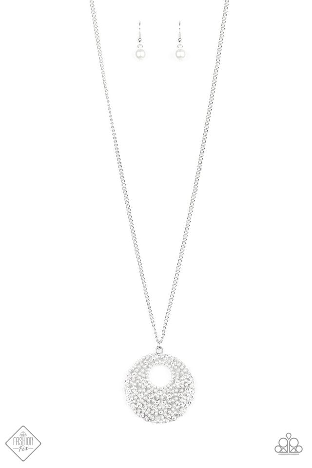A scatter of dainty white pearls and glassy white rhinestones coalesce into a dramatic circular pendant that swings at the bottom of a lengthened silver chain for a timeless look. Features an adjustable clasp closure.