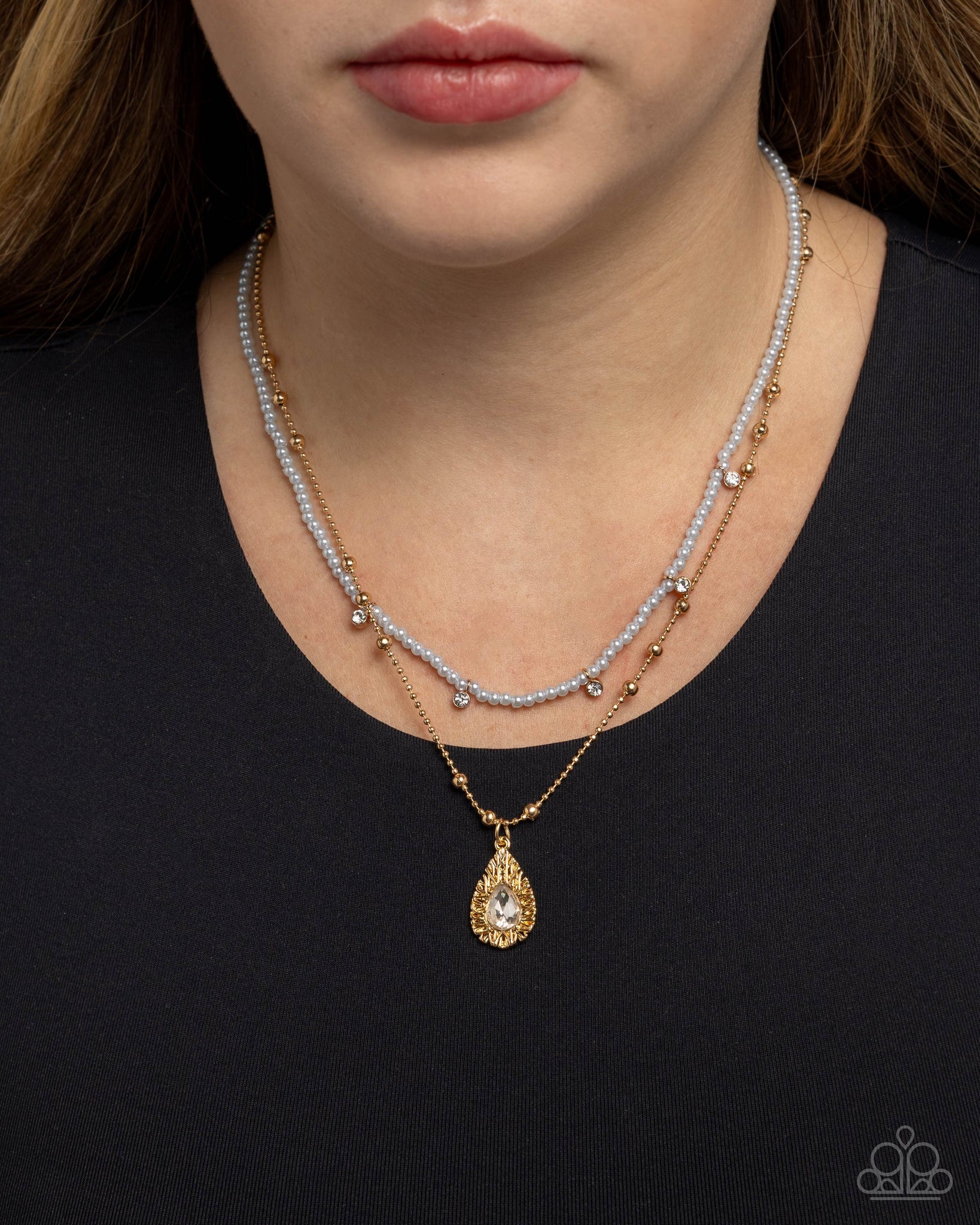 A dainty gold ball chain infused with gold beads and a strand of classic Winter Sky pearls with white rhinestones in gold fittings layer below the neckline. Gliding along the lowermost chain, a linear-textured gold teardrop frame is dotted with a white teardrop gem center, creating a luxurious display. Features an adjustable clasp closure.