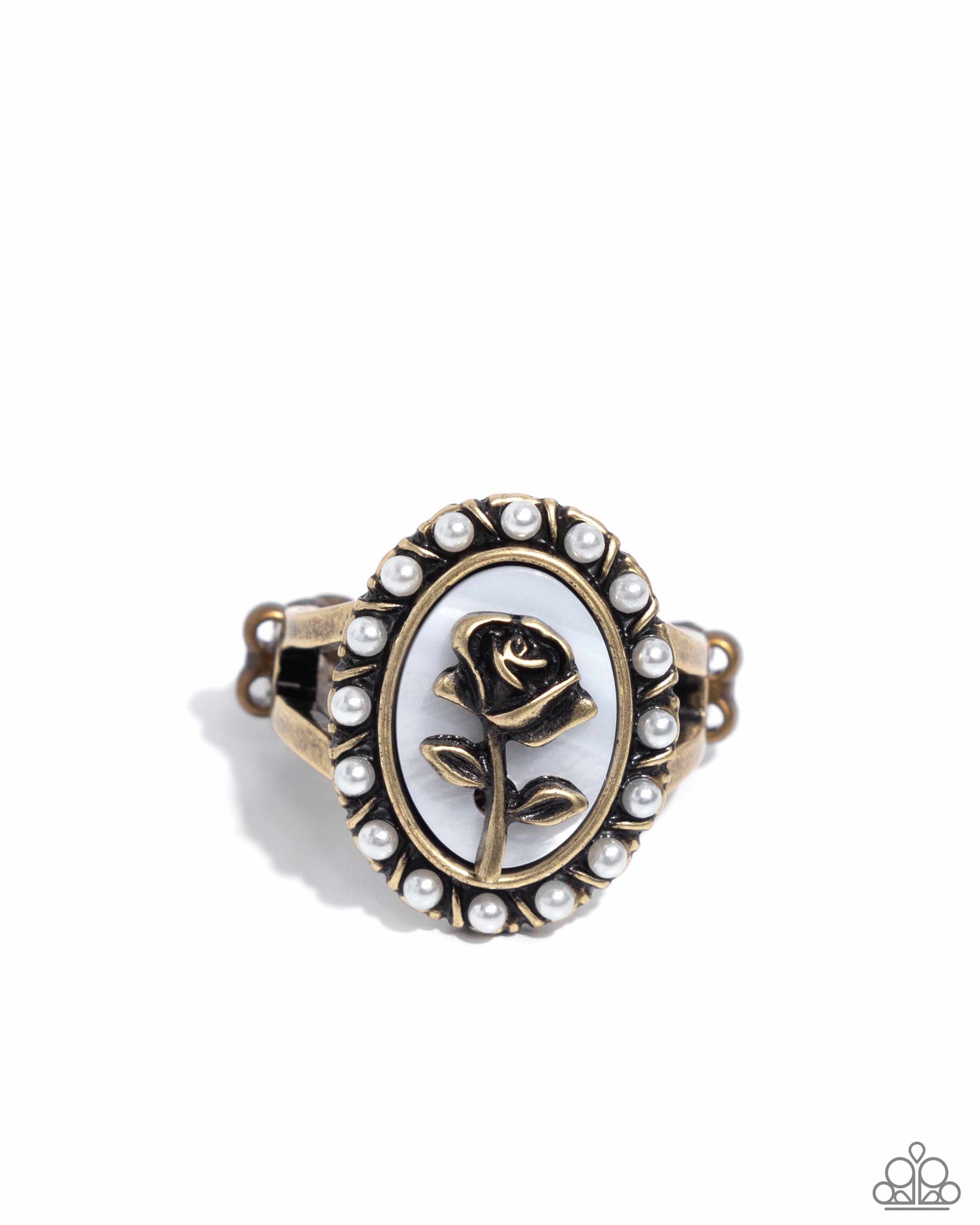 Featuring a white shell backdrop, a brass rose and stem gleam atop the finger, for a broach-like centerpiece. Dainty white pearls are embedded along the oval brass frame, drawing further attention to the tactile detail of the delicate flower. Features a stretchy band for a flexible fit.