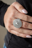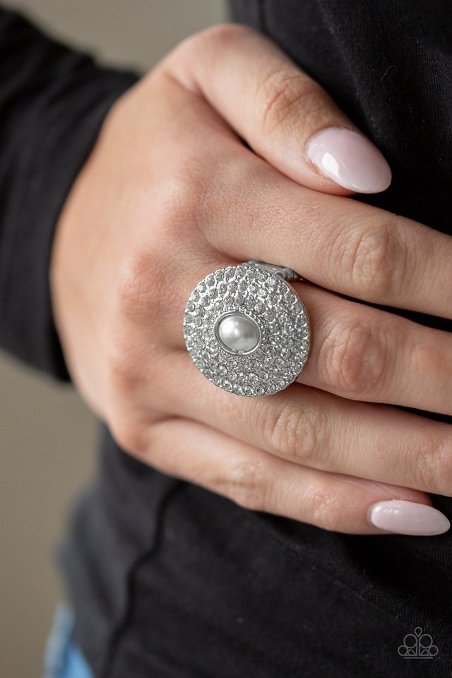 A pearly white bead is pressed into the center of a round silver frame radiating with countless white rhinestones, creating a blinding statement piece. Features a stretchy band for a flexible fit.