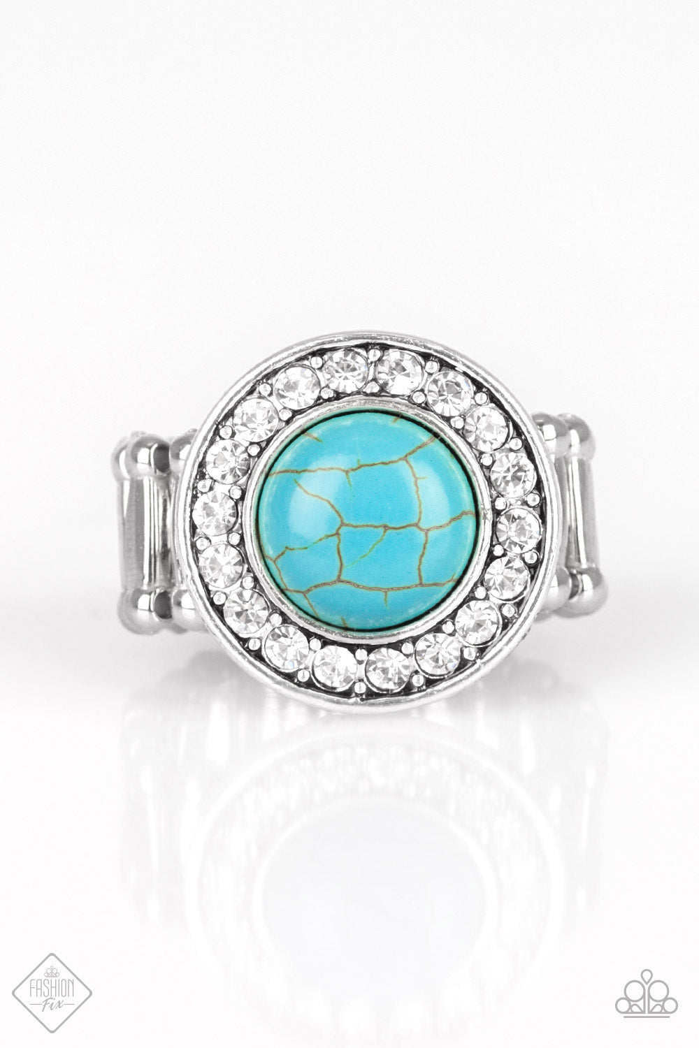 A refreshing turquoise stone is pressed into the center of a round silver frame radiating with glassy white rhinestones, creating an earthy, yet refined design. Features a stretchy band for a flexible fit.