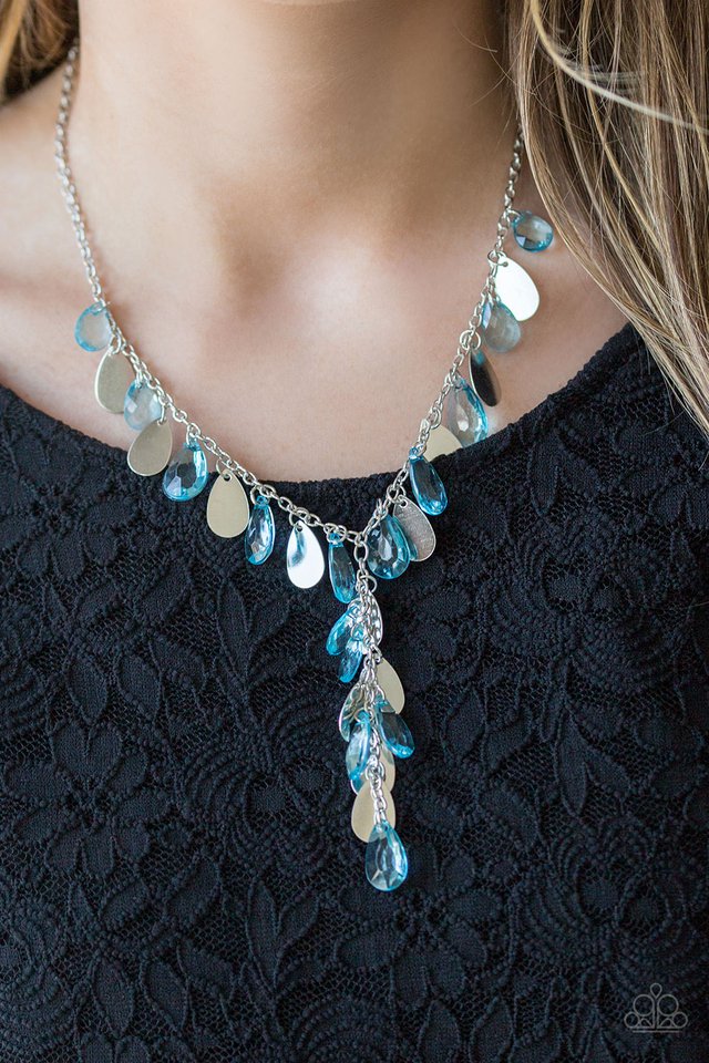 Flat silver teardrops and blue crystal-like teardrops swing from the bottom of a shimmery silver chain below the collar. A matching tassel swings from the center, creating a whimsical extended pendant. Features an adjustable clasp closure.