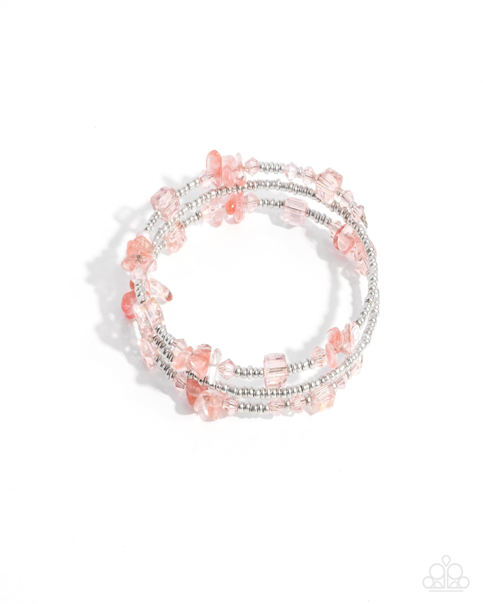 Silver seed beads and various-sized chiseled transparent pink stones and accents are threaded along a coiled wire, creating a refined infinity wrap-style bracelet around the wrist.