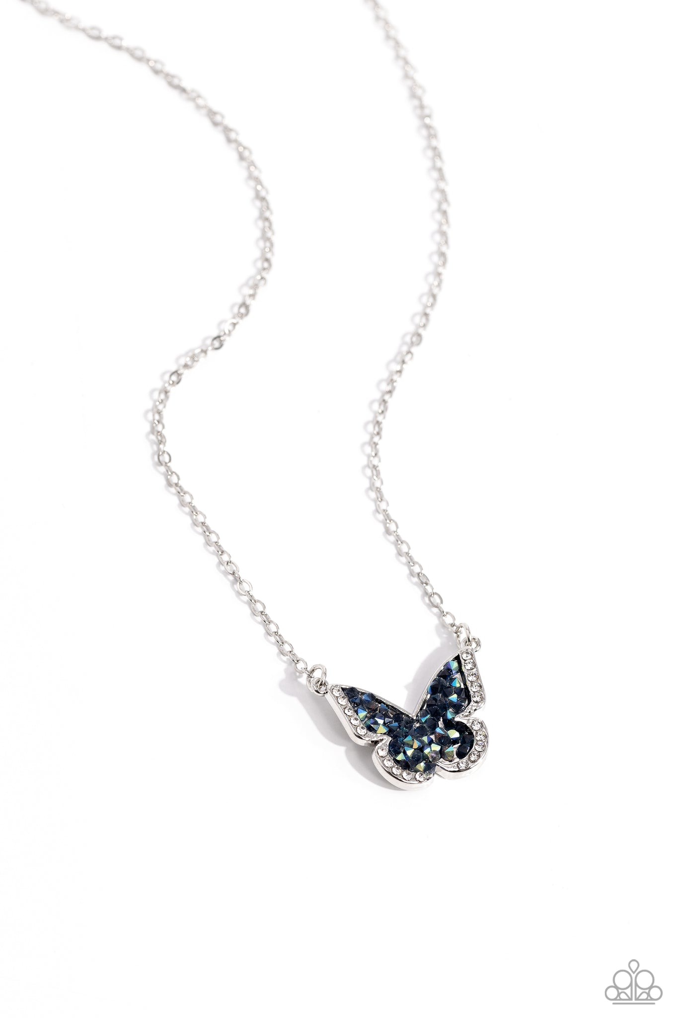 Glittery blue rhinestones are sprinkled along a white rhinestone-encrusted silver butterfly frame, creating a whimsically smoldering pendant below the collar. Features an adjustable clasp closure.