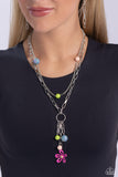 Accented with swirls of Rose Violet, Kohlrabi, and Peach Pink, a Kohlrabi bead and Peach Pink joins an abstract Rose Violet flower with a Kohlrabi center at the bottom of a lengthened silver paperclip chain, creating a noisy charm. A dainty silver box chain, infused with the same three beads layers above the extended display for additional eye-catching color. Features an adjustable clasp closure.