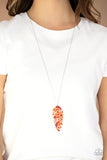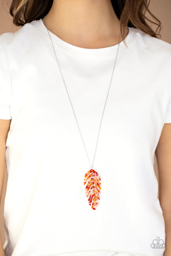 Featuring a shell-like shimmer, dainty orange acrylic frames link into a whimsically stacked feather pendant at the bottom of a lengthened silver chain. Features an adjustable clasp closure.
