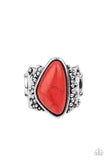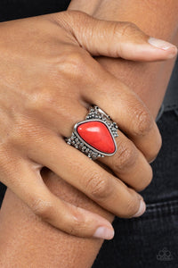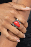 An asymmetrical red stone is pressed into the center of an antiqued silver band radiating with silver studs, creating a rustic centerpiece atop the finger. Features a stretchy band for a flexible fit.