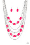 A stunning collection of silver chains and shiny rectangular Raspberry Sorbet beads falls in layers across the chest for a glamorous standout statement. Features an adjustable clasp closure.
