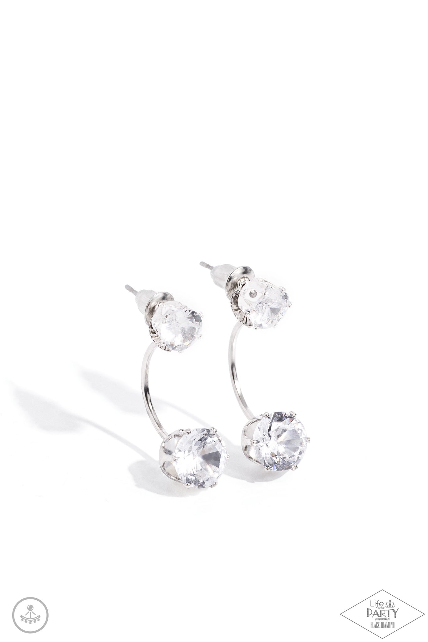A solitaire white rhinestone attaches to a double-sided post, designed to fasten behind the ear. Dotted with an oversized white rhinestone, the double-sided post peeks out beneath the ear for a dramatic look. Earring attaches to a standard post fitting.