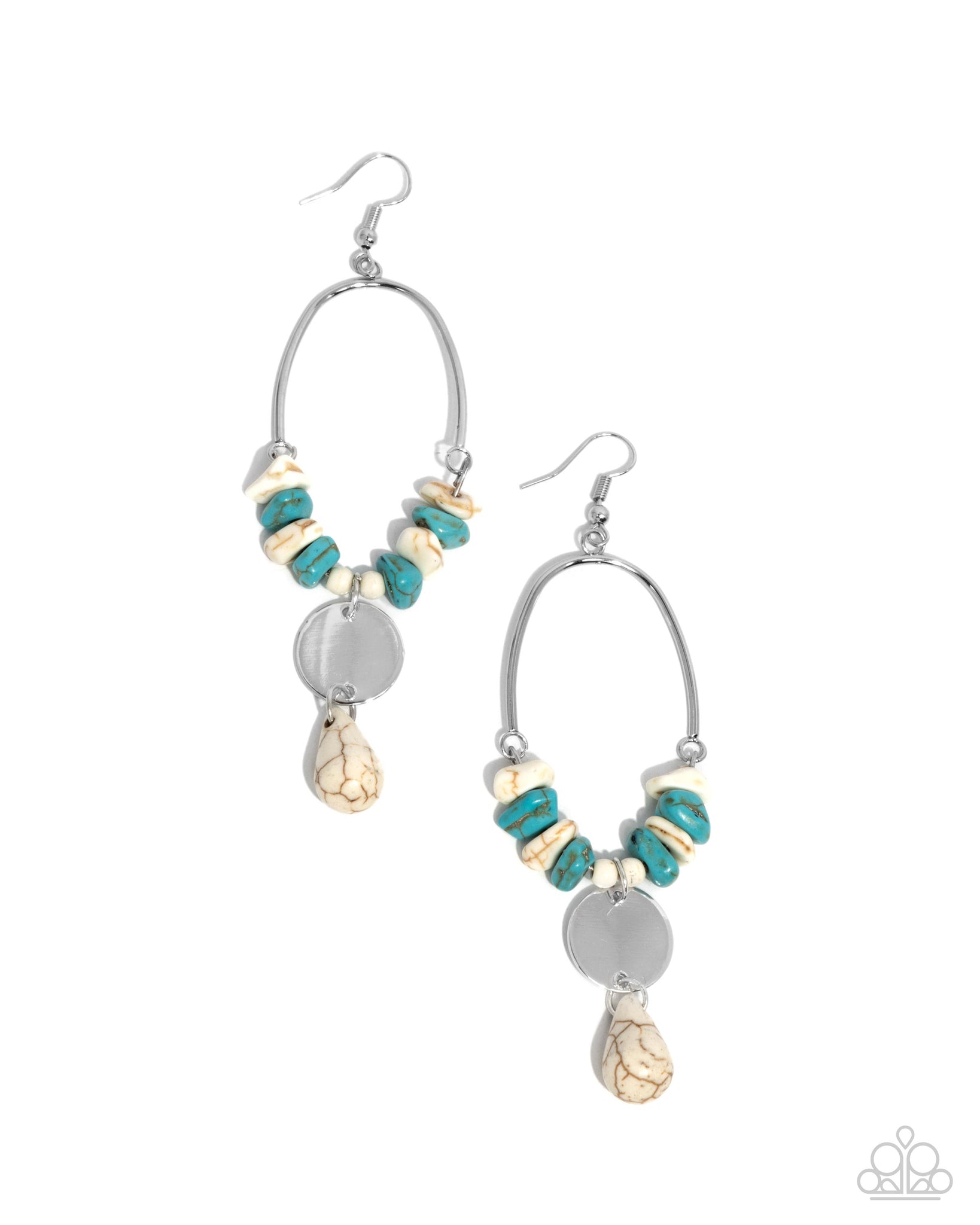 Connected to a silver half-oval frame, chiseled white and turquoise stone pebbles, and white stone beads create an indulgent border around the bottom of the frame, giving way to a silver disc and solitaire white teardrop stone for a demurely refreshing lure. Earring attaches to a standard fishhook fitting. As the stone elements in this piece are natural, some color variation is normal.