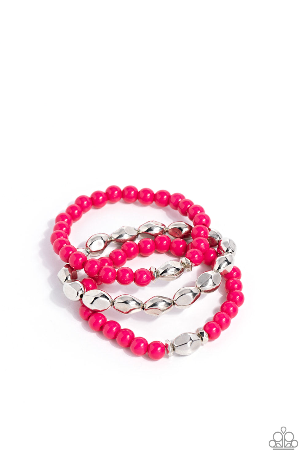 Vibrant Pink Peacock beads mix with warped, silver rhombus beads to create a colorfully geometric statement around the wrist. Strung on elastic stretchy bands around the wrist, silver accents create additional high-sheen detail on the sweet stack.