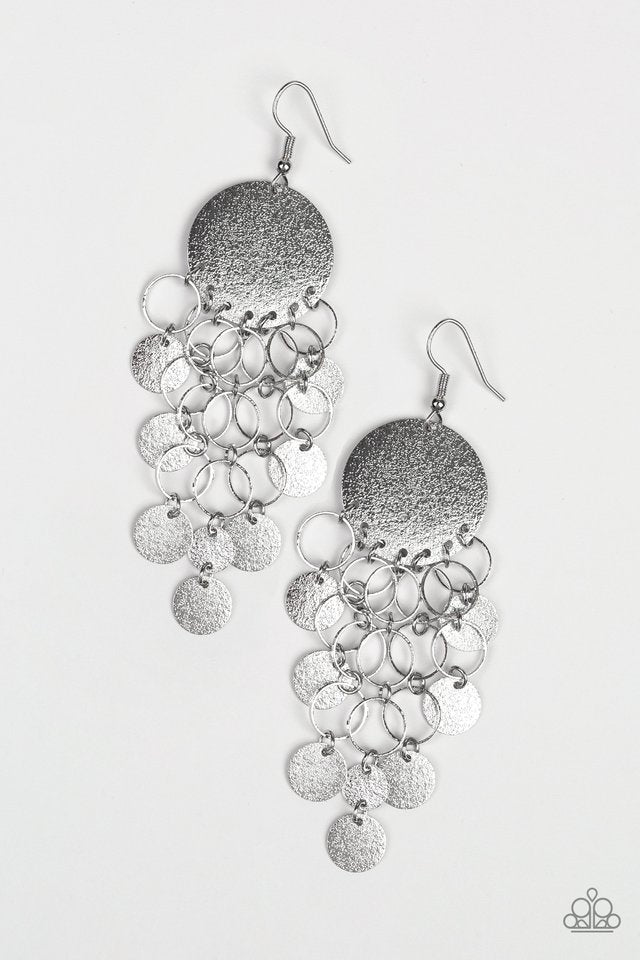 A collection of glistening silver rings and dainty silver discs cascade from the bottom of a shimmery silver frame, creating a refined fringe. Earring attaches to a standard fishhook fitting.