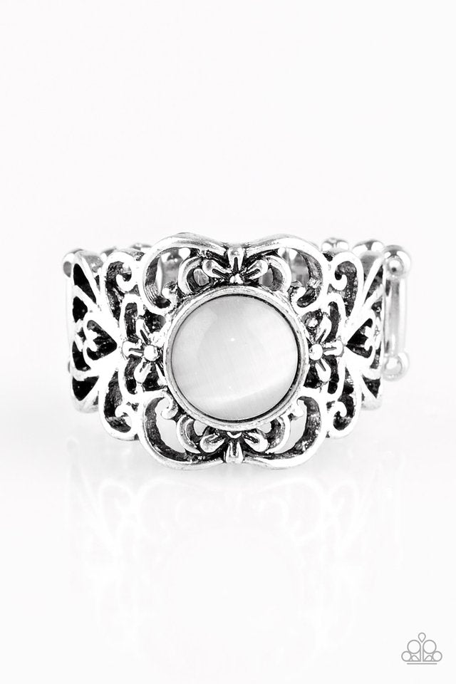 A glowing white moonstone adorns the center of a silver band swirling with whimsical floral detail for a seasonal look. Features a stretchy band for a flexible fit.